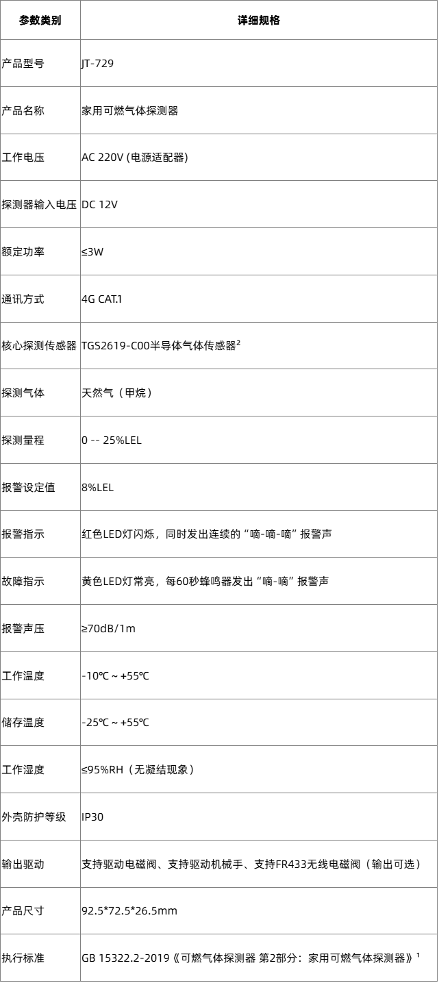 JT-729联网型家用燃气报警器是由深圳市海曼科技股份有限公司(以下简称海曼)(Heiman)推出的高稳定性室内家用可燃气体探测器,专为家庭、公寓场所的天然气泄漏监测与安全防护设计。探测器采用进口半导体传感器,具有检测精度高、响应速度快等特点。传感器具有良好的抗酒精干扰的特性,适合家庭厨房环境使用。当探测器检测到有天然气泄漏且气体浓度达到探测器设定的报警值时,探测器红色LED灯闪烁,发出报警声,及时提醒人员注意用气安全。。