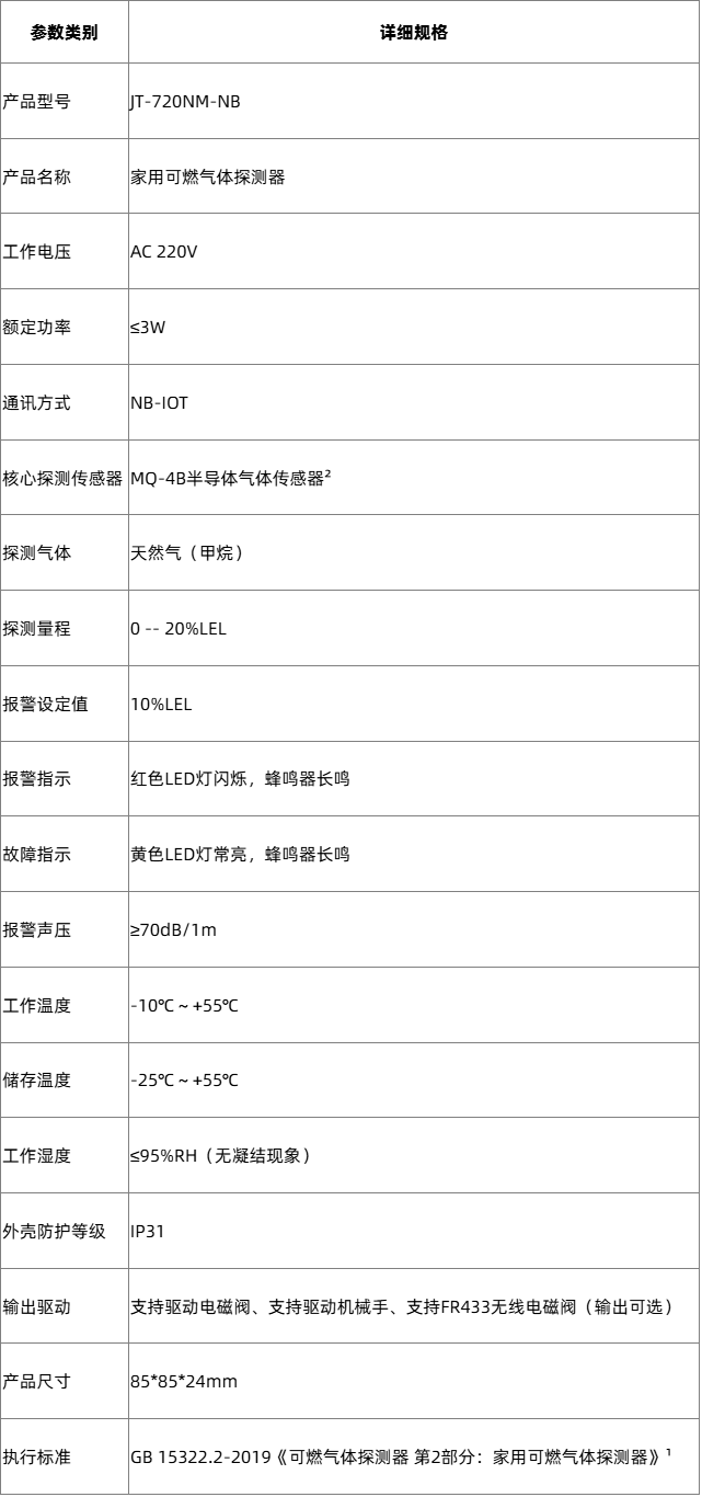 JT-720NMS联网型家用燃气报警器是由深圳市海曼科技股份有限公司(以下简称海曼)(Heiman)推出的高稳定性室内家用可燃气体探测器,专为家庭、公寓场所的天然气泄漏监测与安全防护设计。产品搭载高可靠半导体气体传感器,严格符合中国国标GB 15322.2-2019《可燃气体探测器 第2部分:家用可燃气体探测器》标准¹,并且在NB-IOT物联网的加持下,可通过管理平台实推送实时告警信息在监管人的手机上。可精准探测天然气泄漏,提前预警燃气安全风险,搭配电磁阀或者机械手,在燃气泄漏时可联动切断天然气阀门,预防气体泄漏引发的爆炸、火灾等安全事故,是全球民用燃气安全防护领域的高可靠性标杆产品。