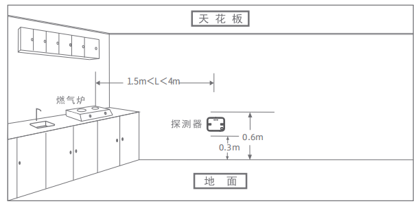 安装位置:用于检测液化石油气的可燃气体探测器,安装位置应距燃具、阀门、气瓶等燃气设备1.5米至4米,安装高度距地面0.3米至0.6米。,符合《城镇燃气设计规范》GB 50028-2020相关要求4