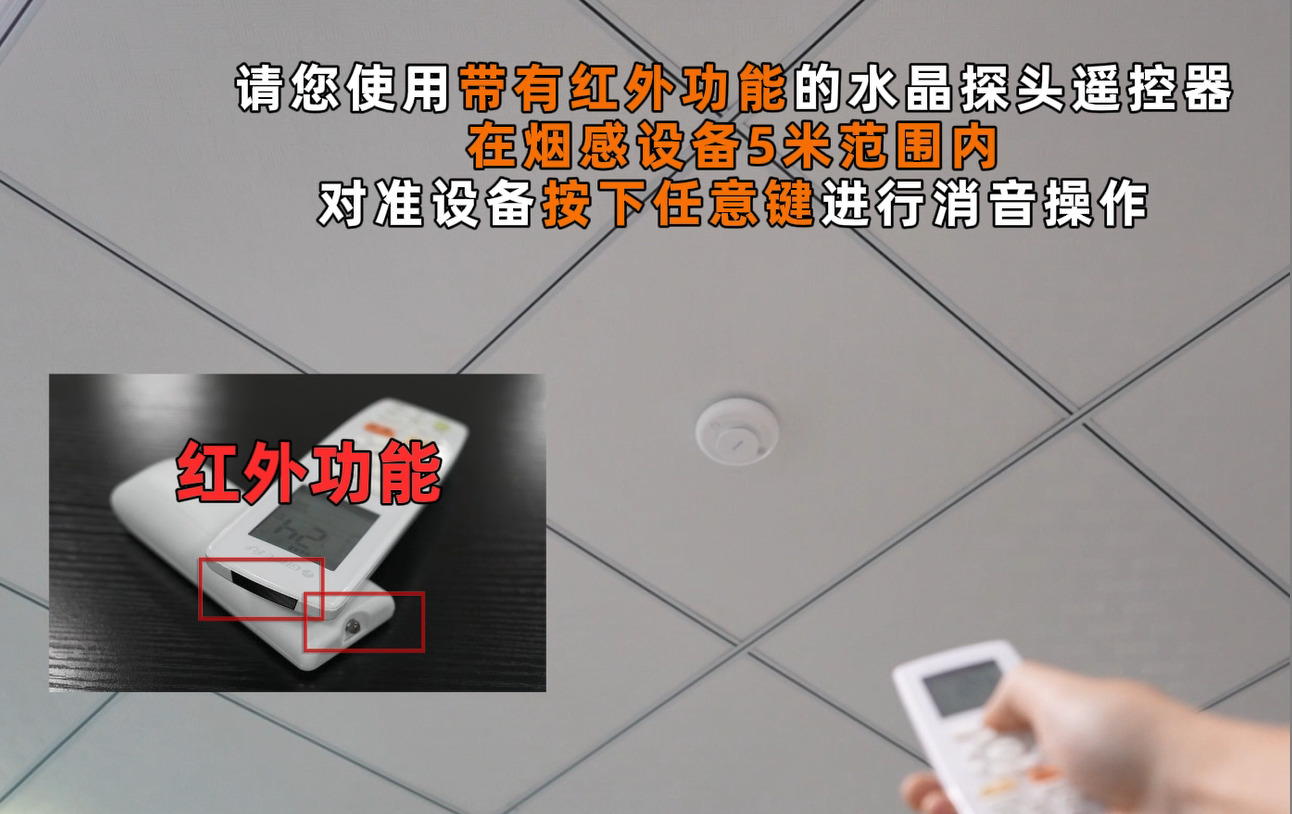 ,这款产品有红外消音功能,在无烟雾的情况下,产品报警,可以通过带有红外功能的遥控器来进行消音,只需在5米范围内对准烟雾报警器按下任意键即可。